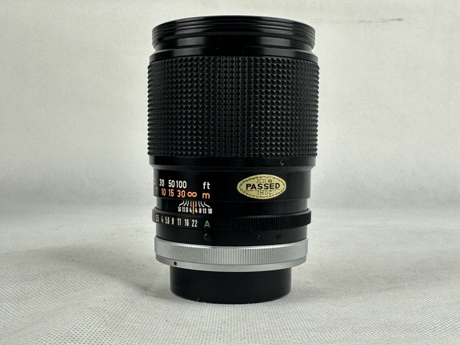 This Canon FD 135mm F2.5 S.C. telephoto lens is a great addition to your photography gear. With its manual focus and compatible with Canon FD mount, this lens is perfect for Canon enthusiasts. The exterior is made of durable metal and comes with caps, a filter, and a case for added protection.