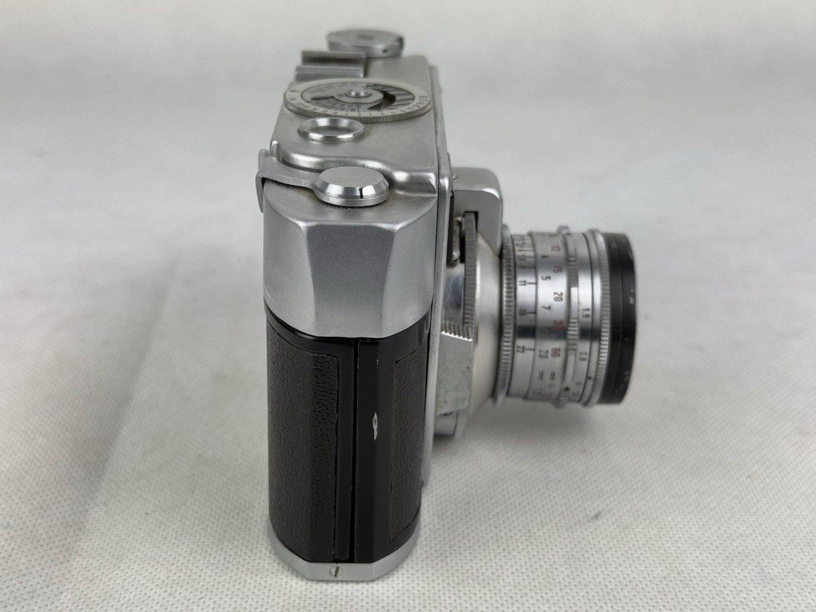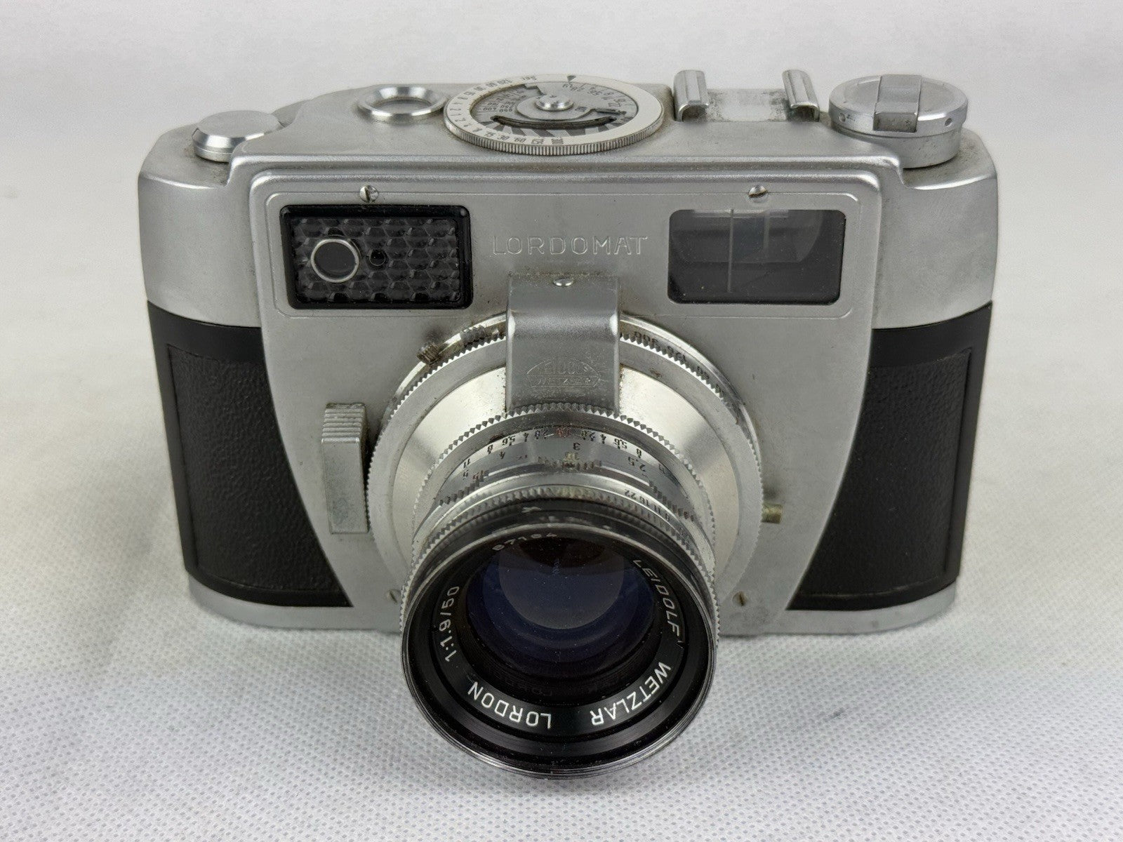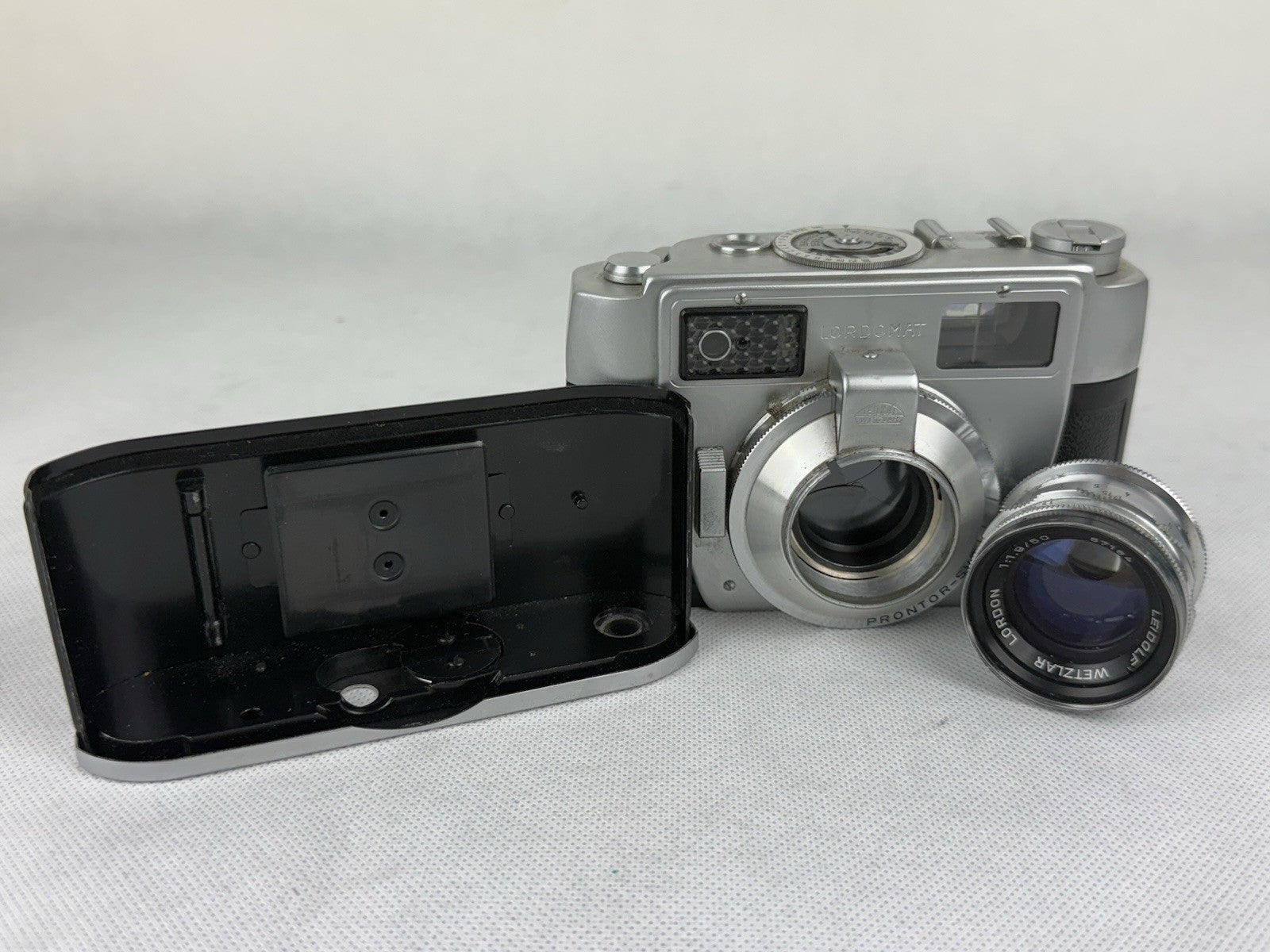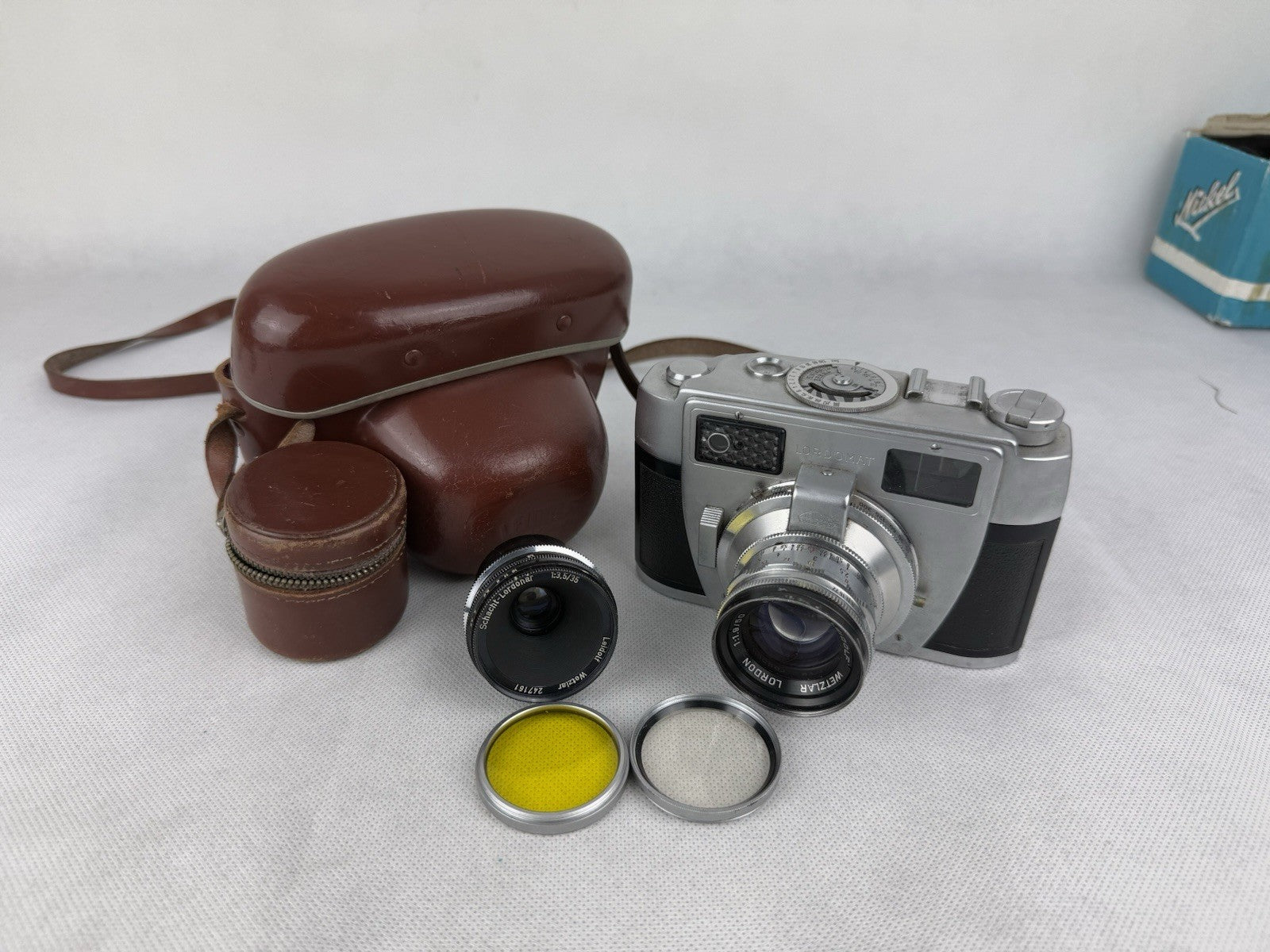 The Leidolf Lordomat Full Set Lordon 1.9 50mm and Schacht Lordonar 3.5 35mm with case is a vintage film camera set by Leidolf Wetzlar. This set includes a Lordon 1.9 50mm lens and a Schacht Lordonar 3.5 35mm lens, perfect for film photography enthusiasts looking to capture images in 35mm format. The silver color adds a classic touch to this set, making it a unique and stylish choice for those who appreciate vintage camera equipment.